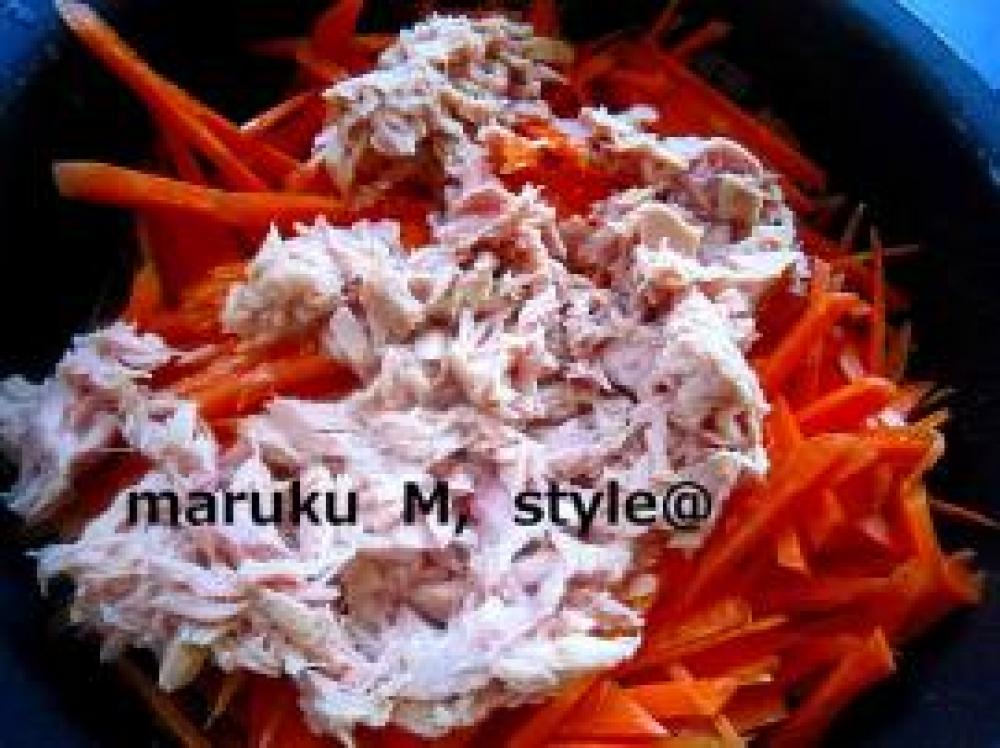 ![]() 人参をその上にのせます。シーチキンも軽く油をきりのせます。それをのせたら、混ぜません。