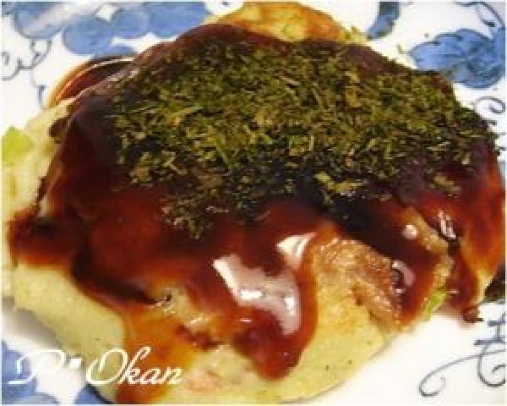 豚肉以外の材料をすべて混ぜサラダ油をひいたフライパンに丸くなるように乗せ、豚肉を乗せて両面を焼く。