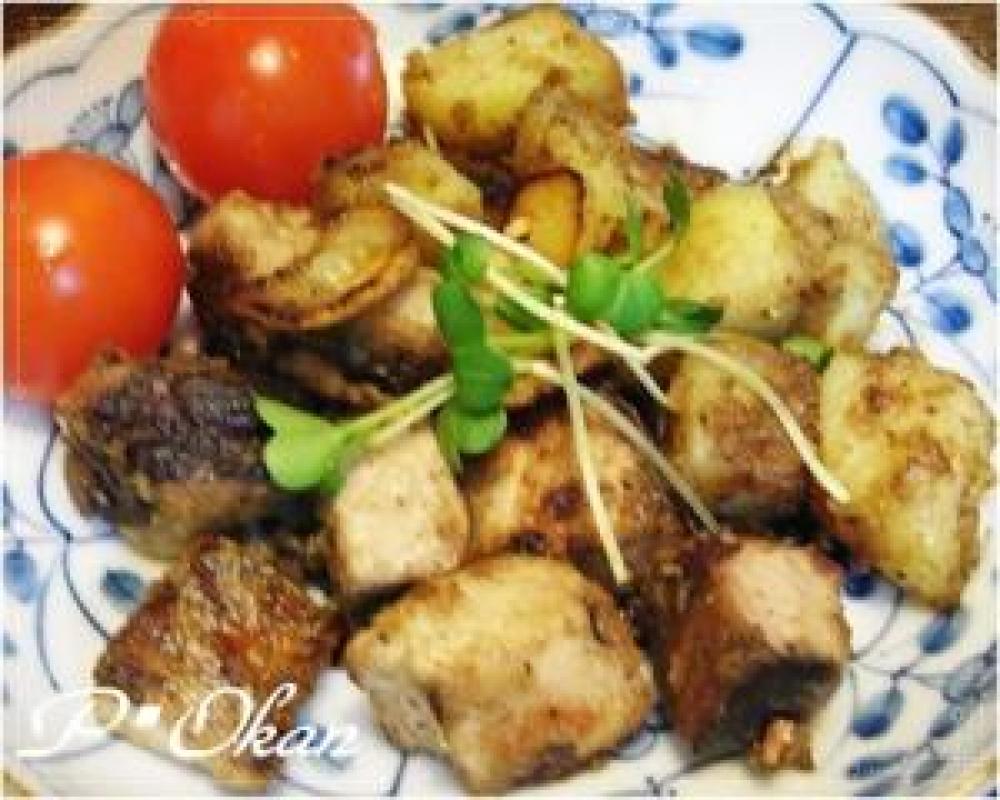 ジャガイモ、カツオに小麦粉をまぶす。