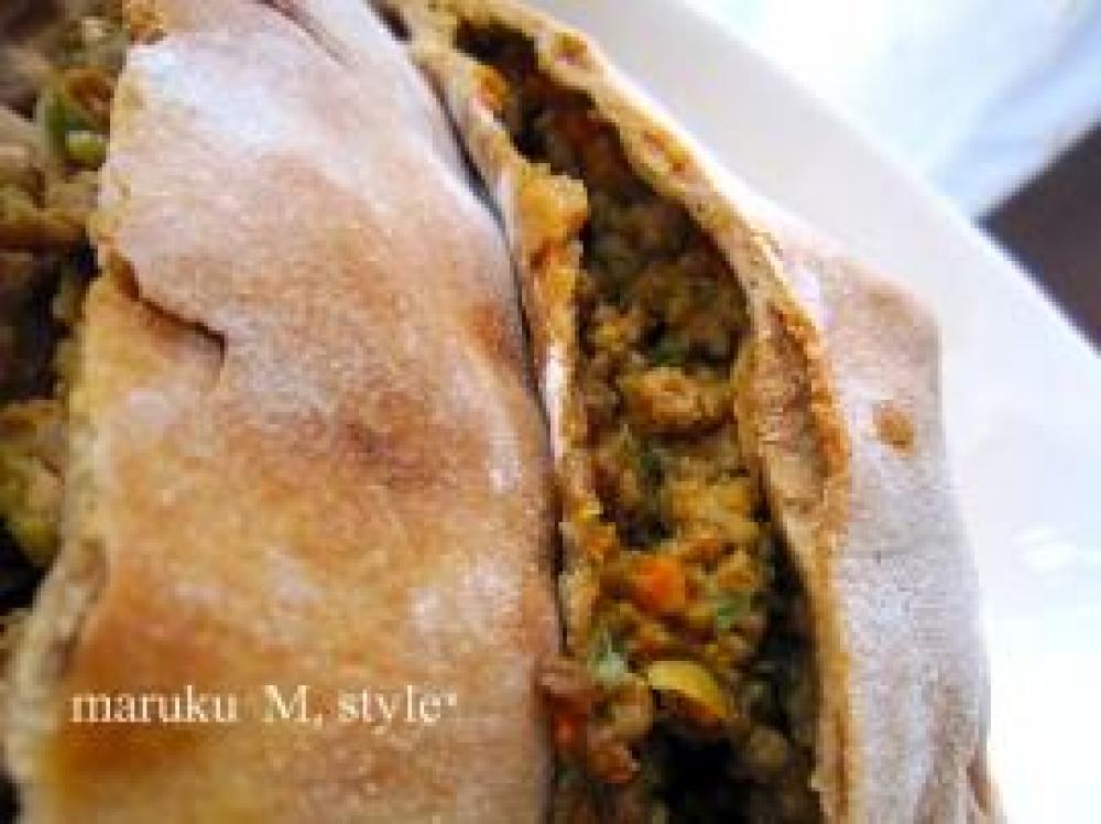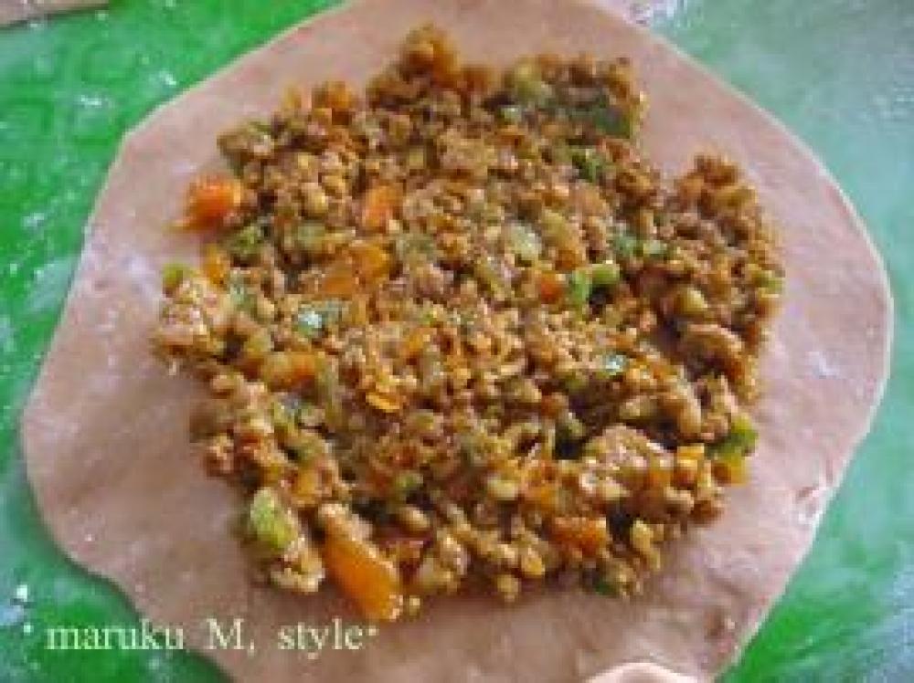 ![]() ここに先ほどのキーマカレーぽいのを入れます。端は残しておきます。