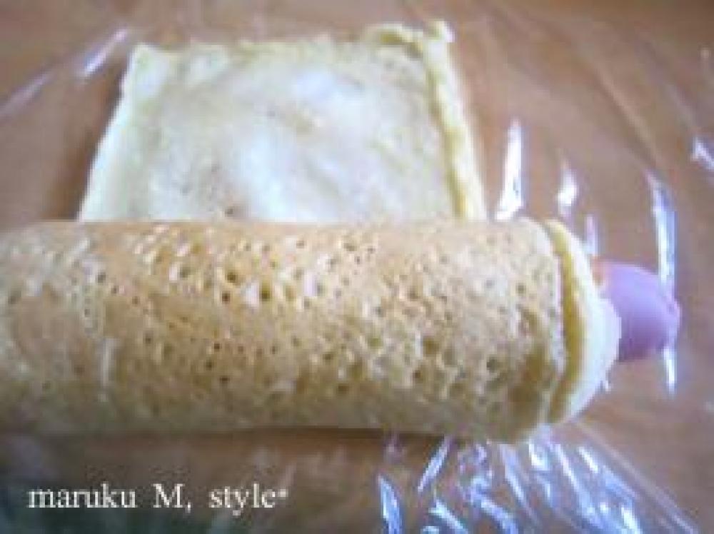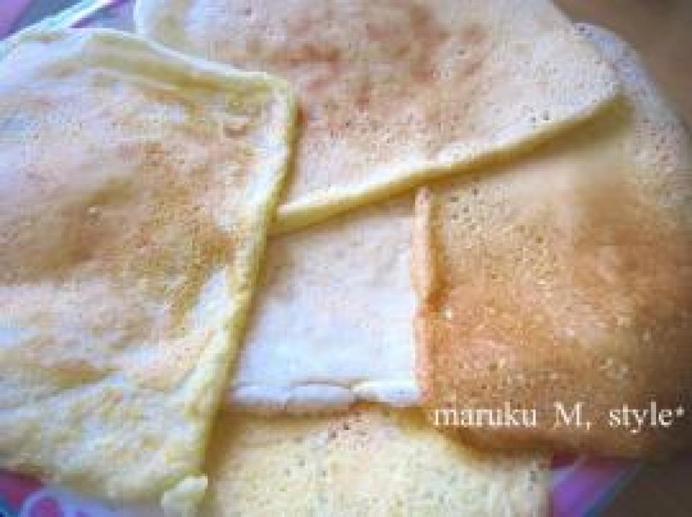 ![]() ★の材料を良く混ぜて熱した卵焼き機で1まいづつ薄く焼きます。だいい12枚から13枚出来ます。