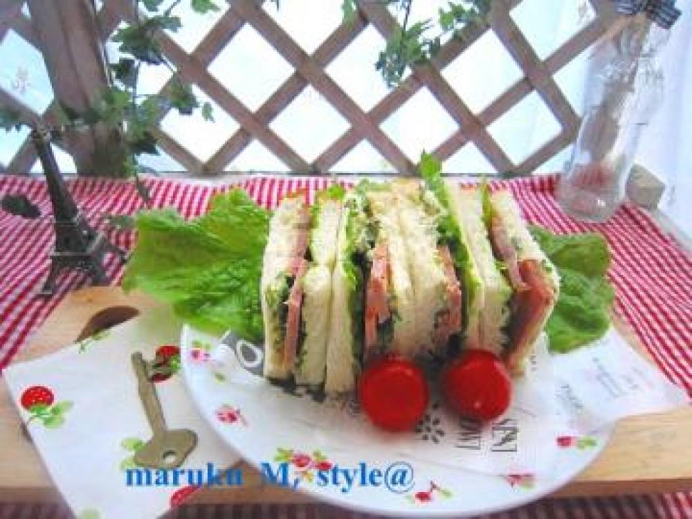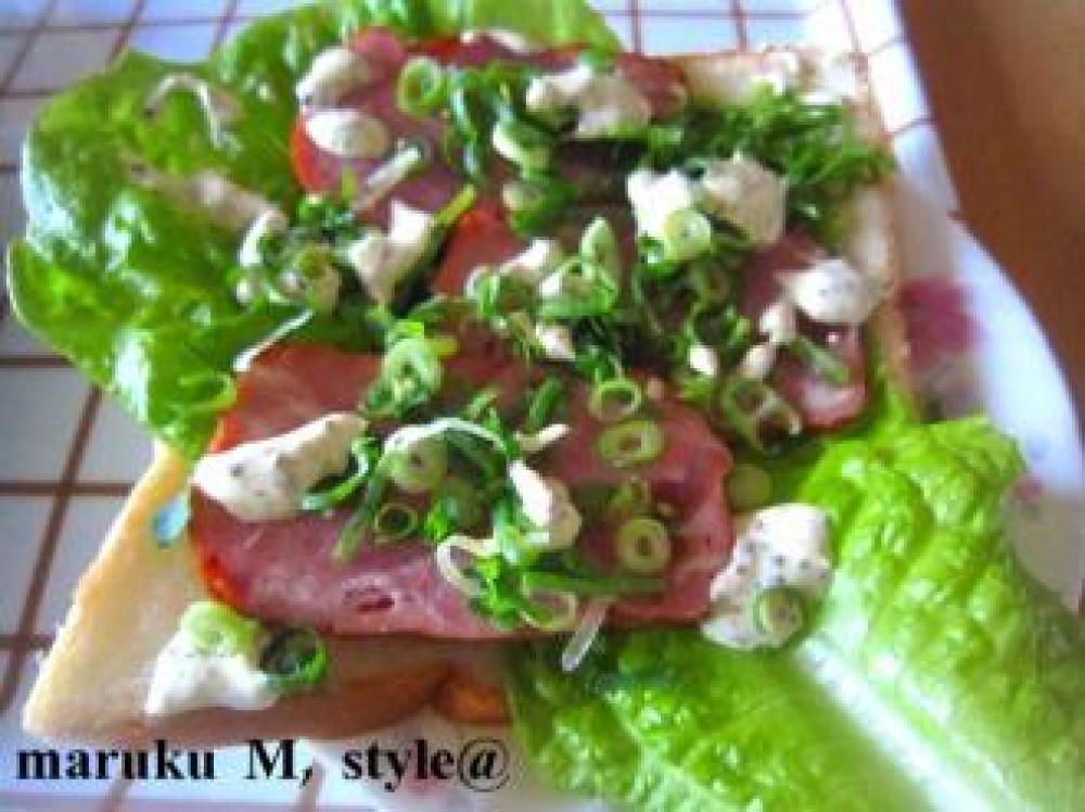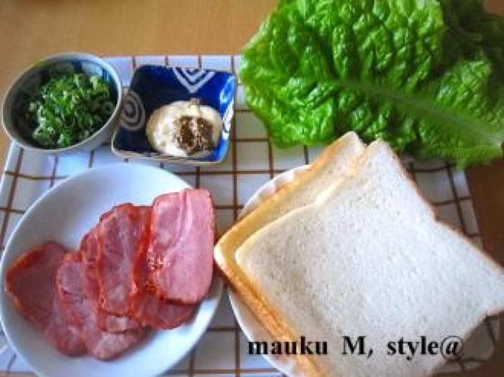 ![]() 食パンに薄ーくマーガリンを塗り、その上にサンチェなどの野菜を乗せます。その上に焼き豚も乗せます。