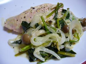 ①に白ワインを加えて、ひと煮たちさせる。アルコールがとんだら、野菜類をまわりによけて、中心に鮭をのせる。