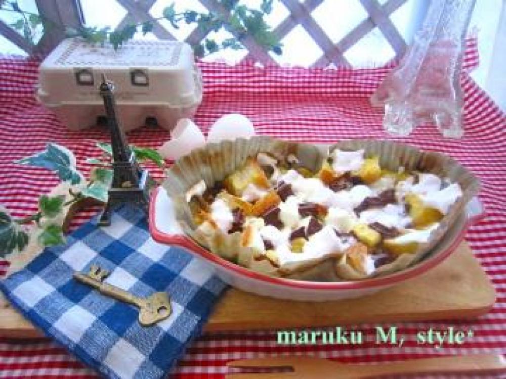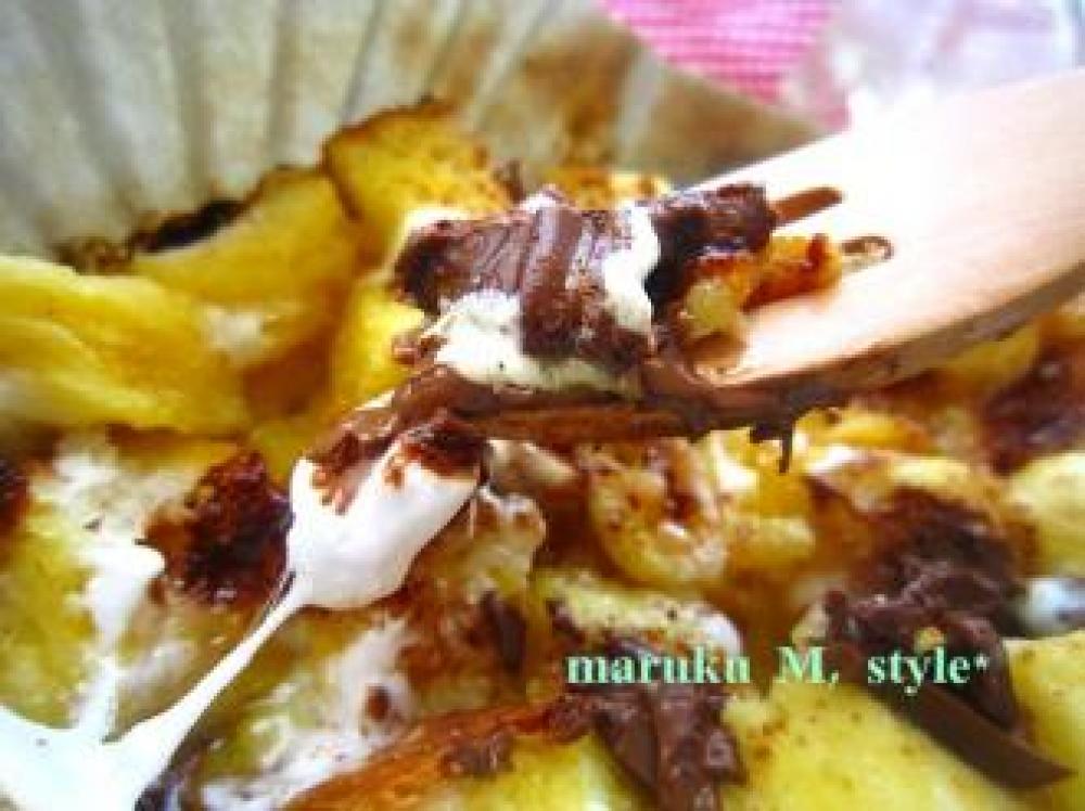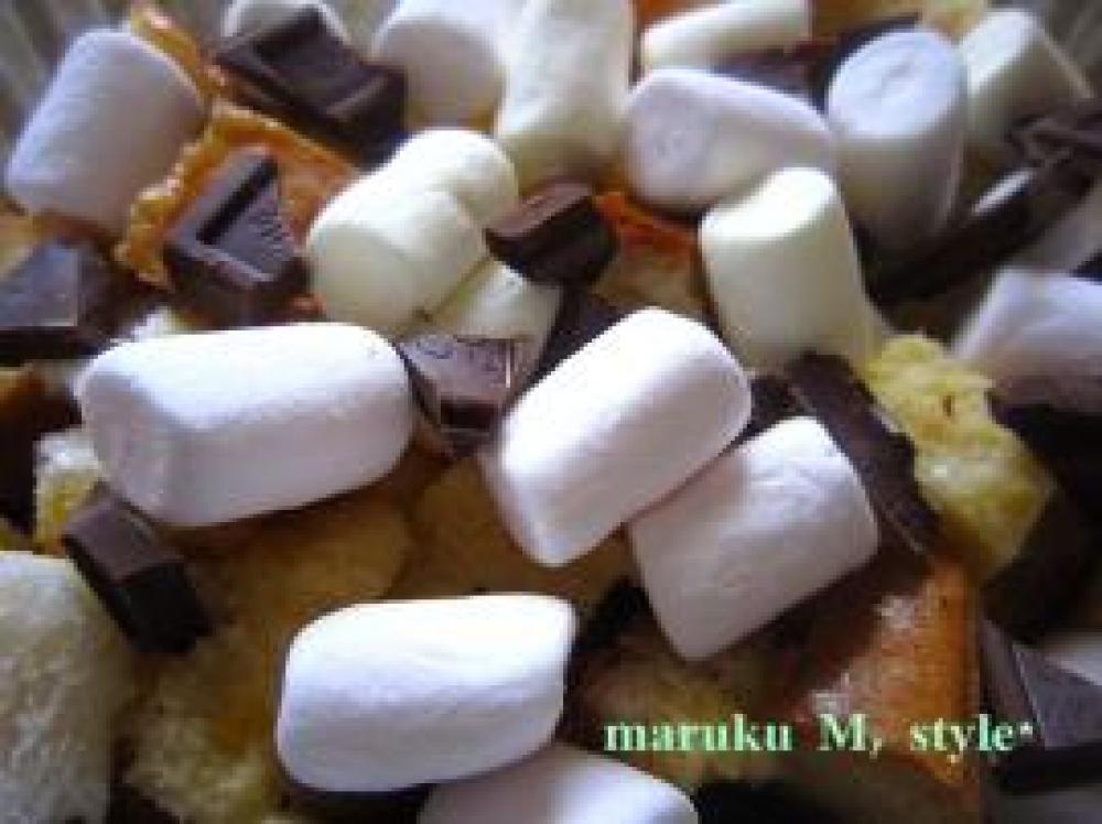 ![]() その上に、ちぎったチョコレートとマシュマロをのせます。