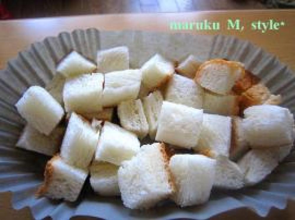 ![]() パンは1cm角に切ります。★の材料をよくあわせて、おきます。