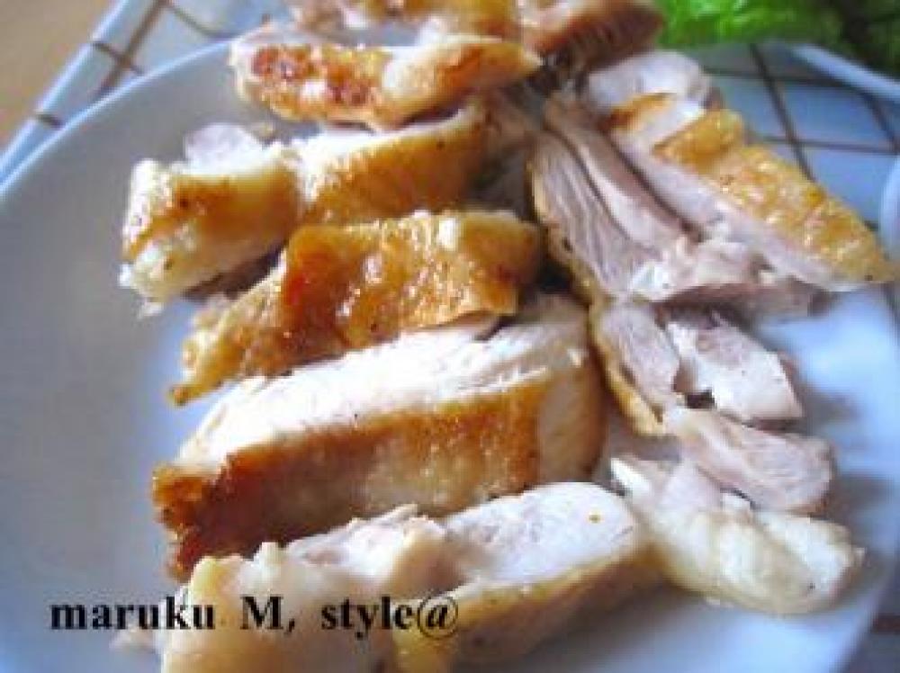 ![]() 鶏も油を引かずにこんがり焼きます、仕上げに、塩と粗挽き胡椒をかけます。薄切りにします。