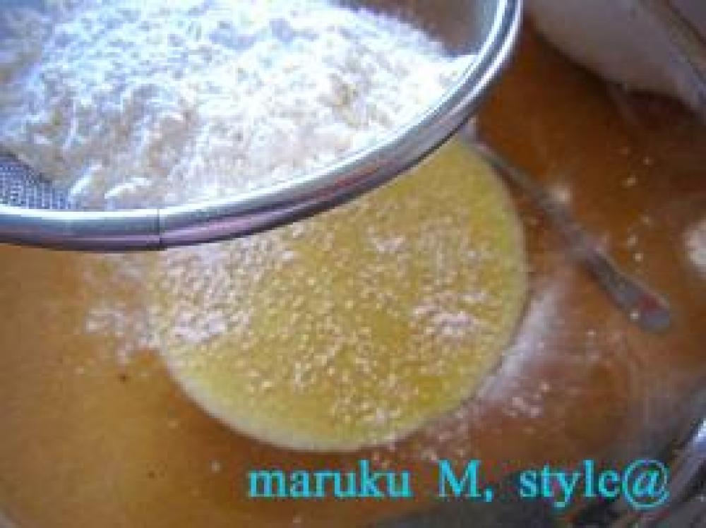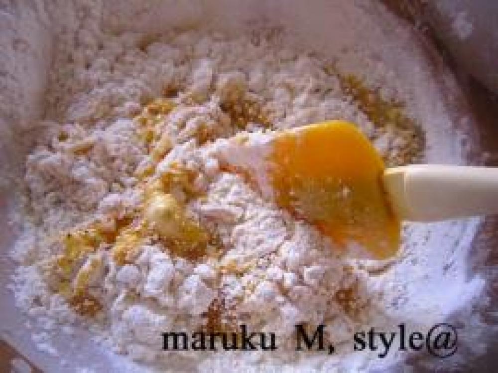 ![]() その中に小麦粉とベーキングパウダーを合わせて振るいながらボールに入れます。シリコンヘラで混ぜ合わせます。