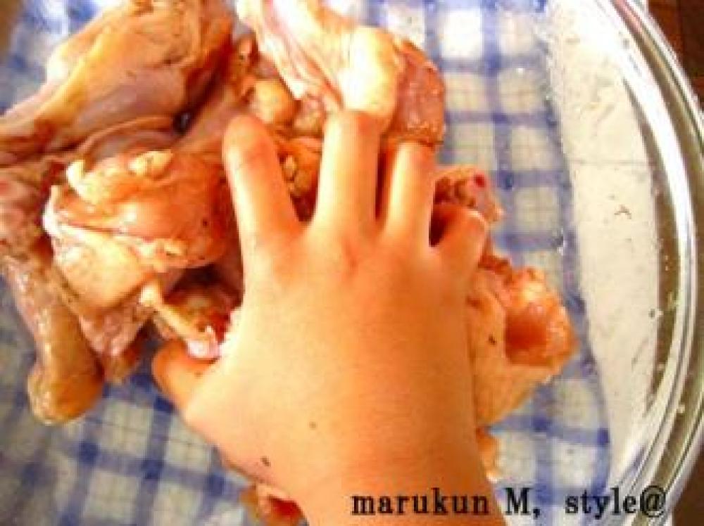 鳥手羽元に★を全部入れてよく揉みまこみます。味を染み込ませるためにしっかり!(長女の手)