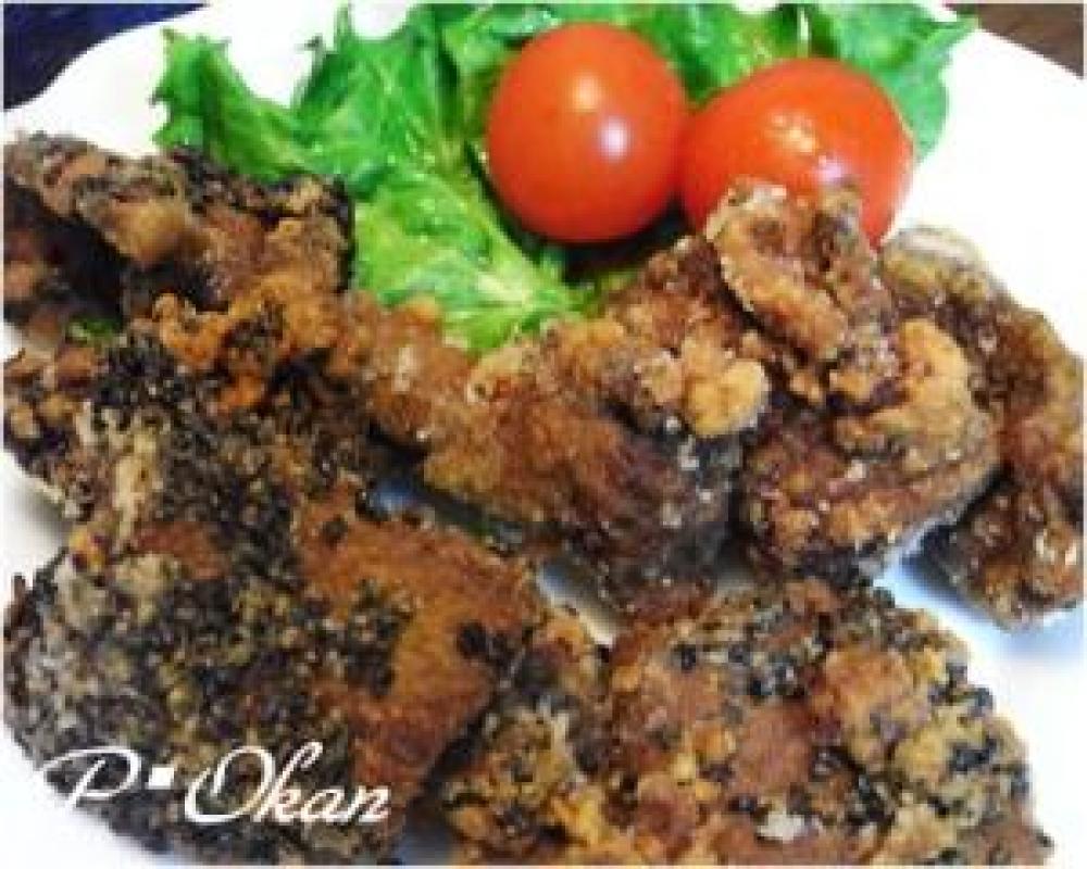 レバーの表面にゴマをつけ、片栗粉と上新粉を混ぜたものをしっかりとつけて中温の油でカリッと揚げたら出来上がり。