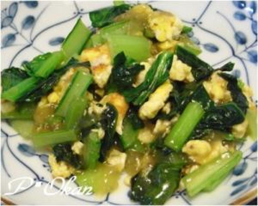 フライパンで小松菜を炒め、2の卵を入れ、味覇、オイスターソース、塩コショウで味付けする。