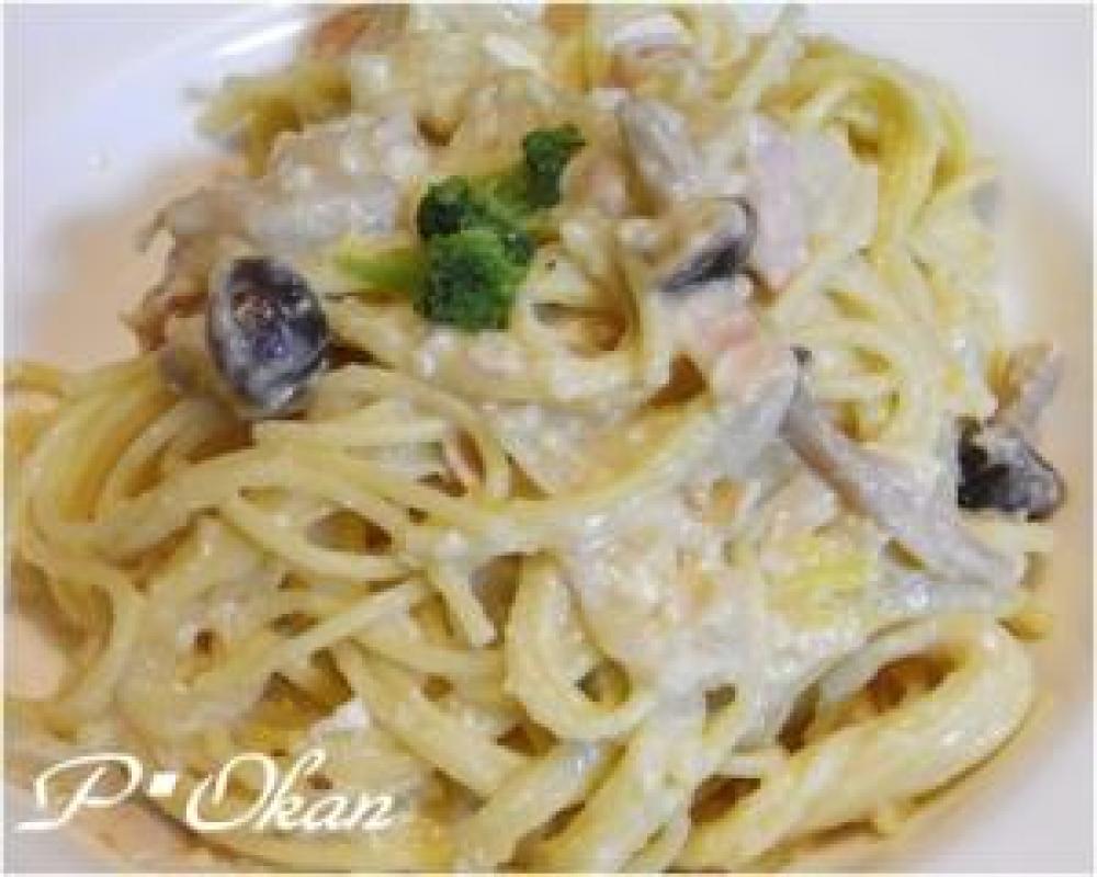 4に卵をほぐしていれてよく混ぜる。パスタに混ぜる。