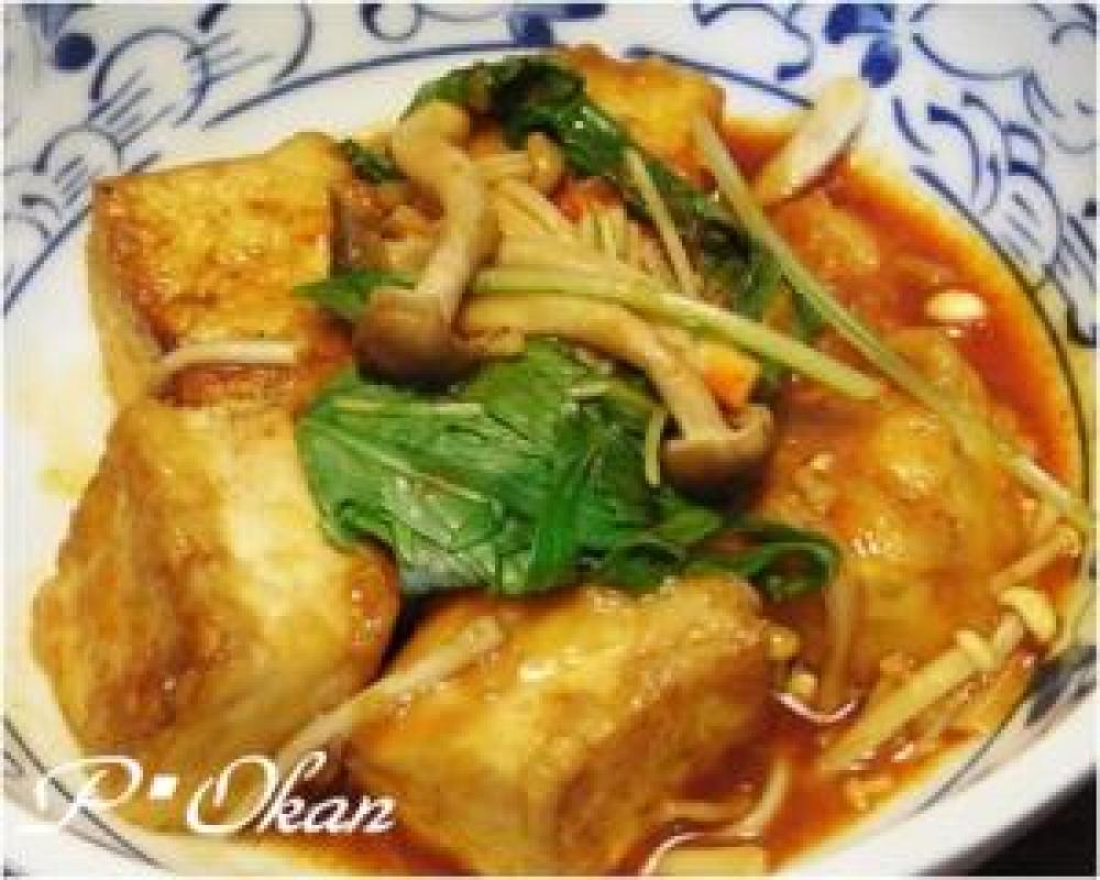 盛りつけるときに水菜も混ぜて豆腐の上に乗せたら出来上がり。