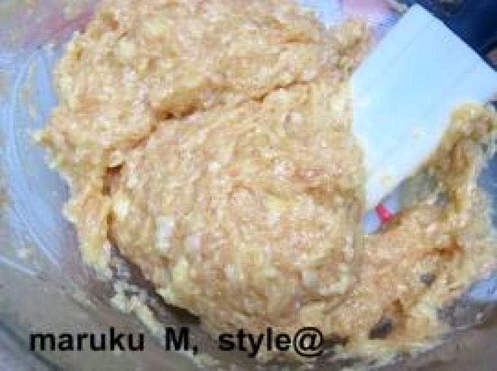 ![]() よく混ざってパン耳の形がなくなれば、他の材料全て入れてよくこねます。