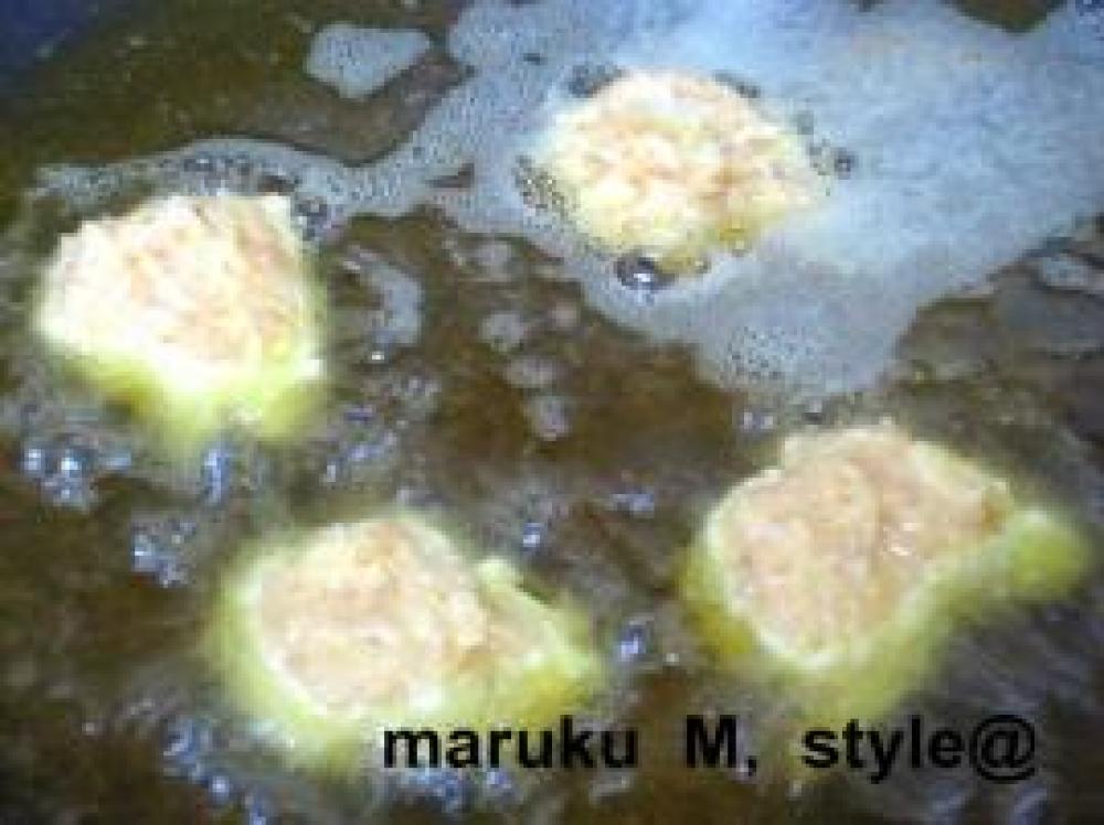 ![]() 後は油の中にスプーンでポトポト、ナゲットの形に落としていきます。