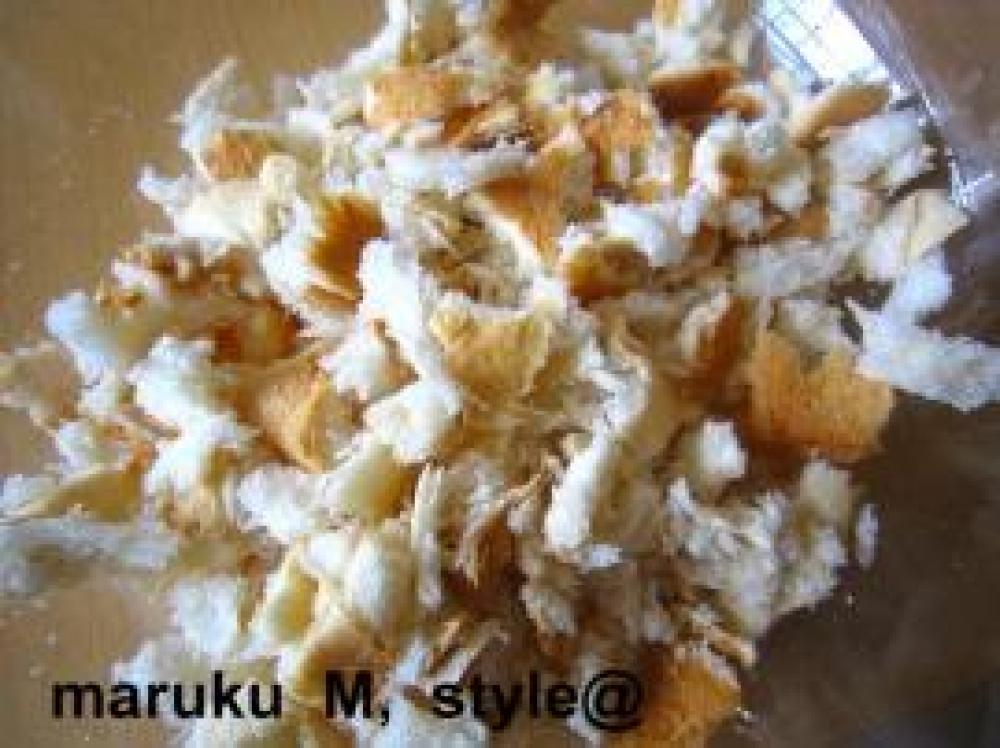 ![]() まずパン耳は細かくちぎるか包丁で切ります。そこへ、豆乳を入れてよくこねます。
