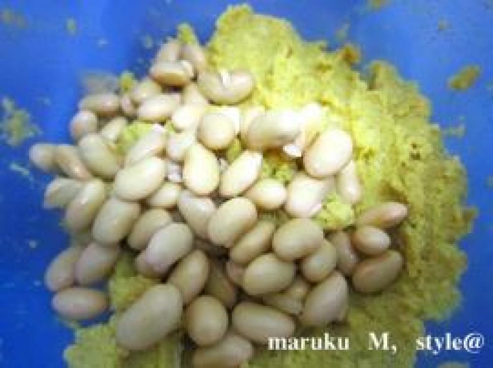 ![]() よく混ざったら、大豆の水煮を入れて軽く混ぜます。