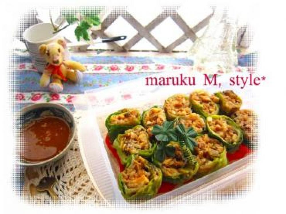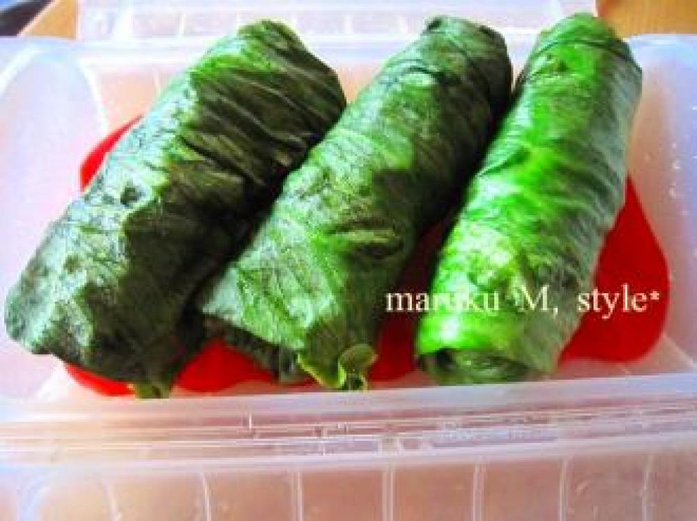 ![]() レタスは1枚ずつレンジで30秒ほどかけてしんなりさせて、水分をふき取り、