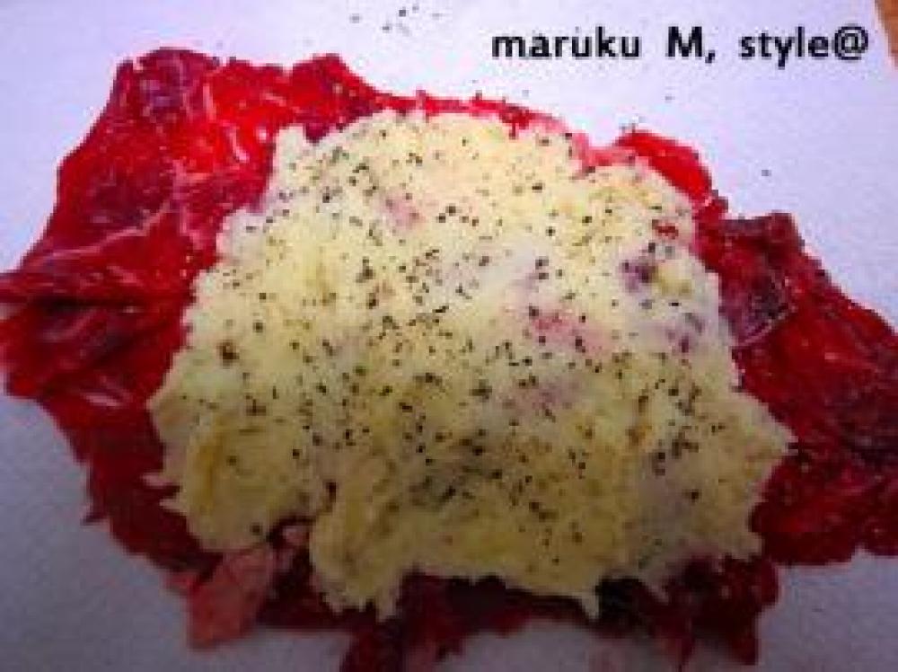 ![]() 牛肉を薄く広げて塩、こしょうを振ります。その上に①のマッシュポテト?を広げて粗挽きこしょうたっぷり!