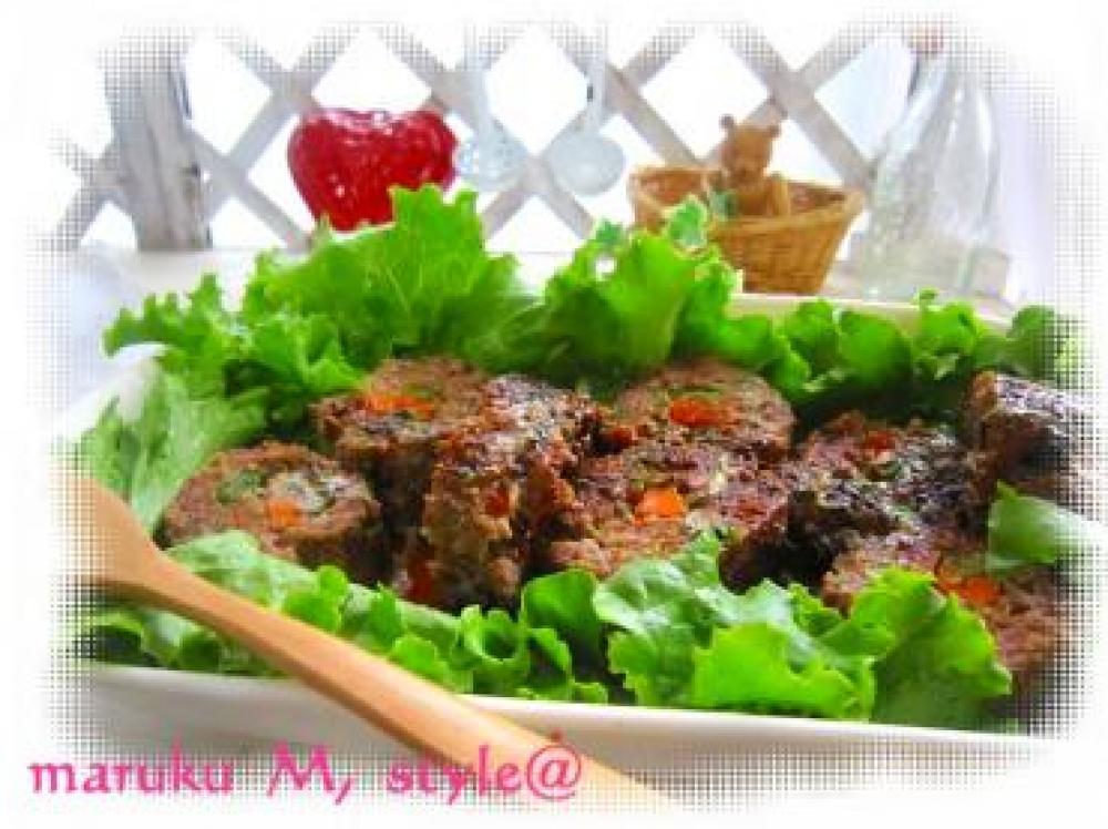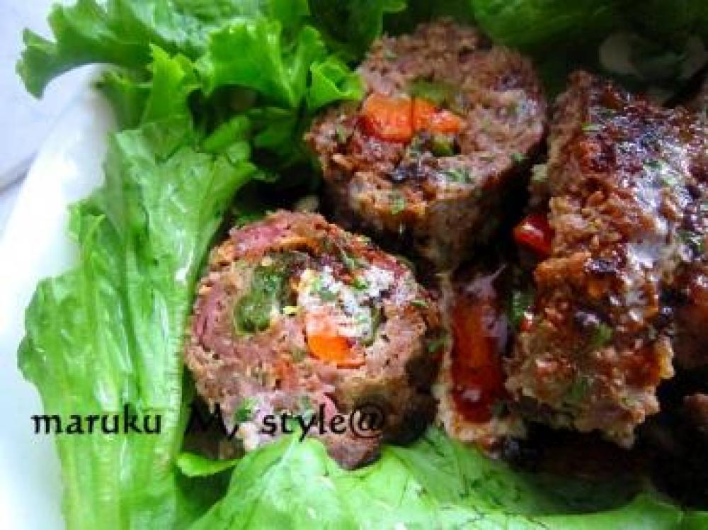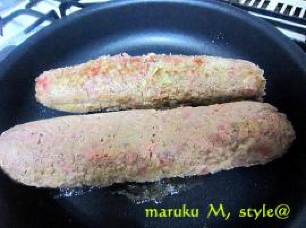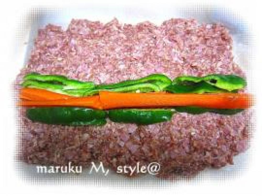 ![]() そこへ、少し片栗粉(分量外)をかけたとこへ、人参とピーマンをのせます。それを巻き寿司の要領で巻きます。