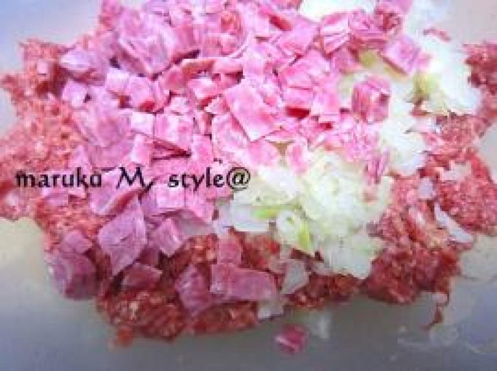 ![]() 混ざったら、5ミリ角に切ったハムを入れて混ぜ合わせます。ボールの中で生地を押し付けて空気を抜きます。