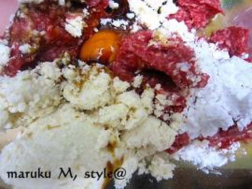 ![]() ボールにひき肉と塩・砂糖、各小さじ1を入れてよく練ります。そこへ、ピーマンと人参以外の材料を全部入れて混ぜます。