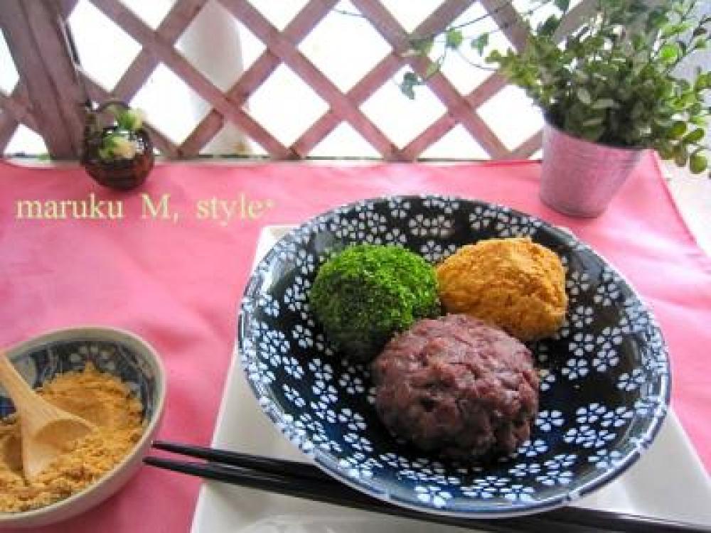 ![]() 中に餡を入れたものは、上に青海苔をまぶしたものと、きな粉にお砂糖を混ぜたものをまぶしました。