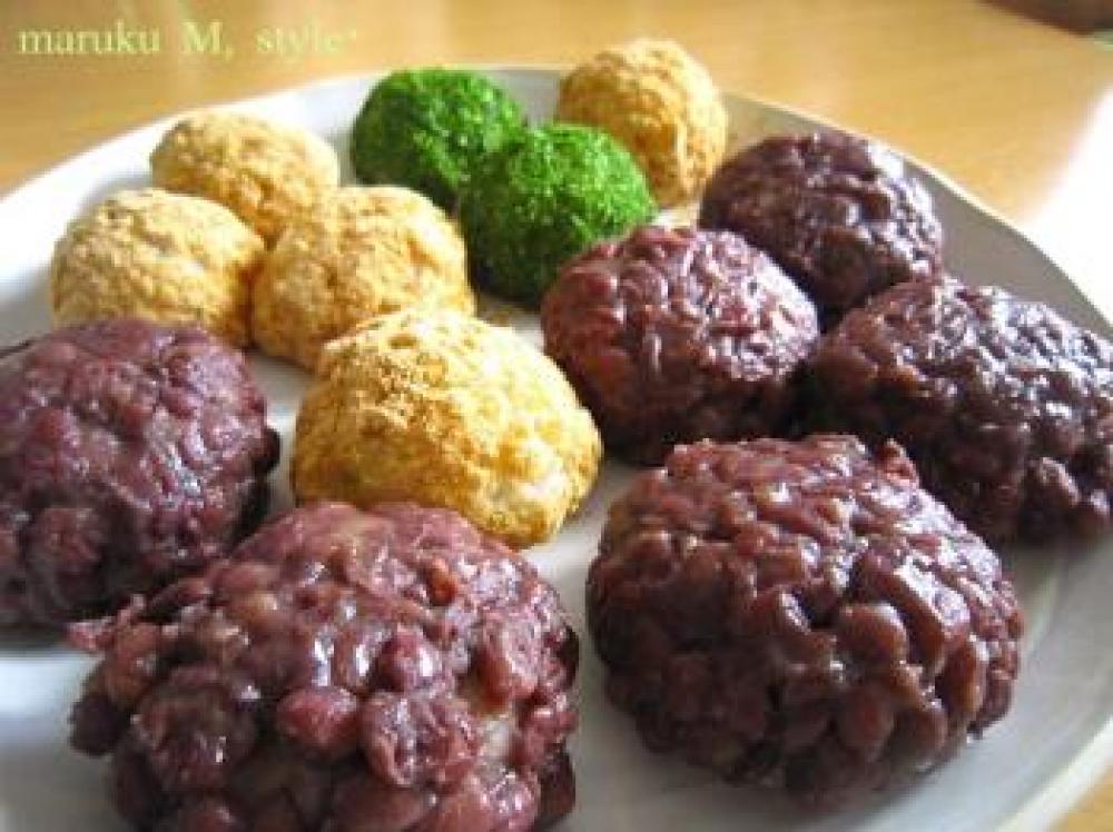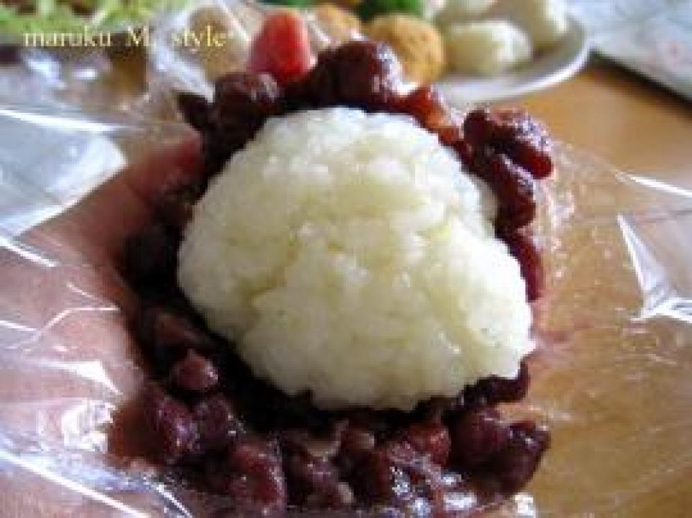 ![]() そして中に餡を入れずにもち米のみ丸めたものは、上から餡で包みます。ラップですると綺麗に餡子がつきます。