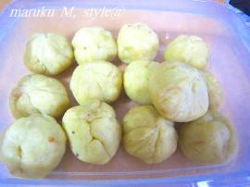 だいたい13個位に分けて(私は均等に量りました)軽く丸めて、(だいたいでいいのです! 中に栗を入れるので)