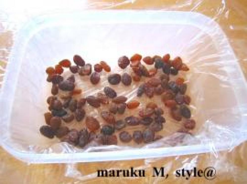 ![]() 後は耐熱皿に(うちはタッパーを使います)。耐熱(150度)ラップをひいて、レーズンをひきます。