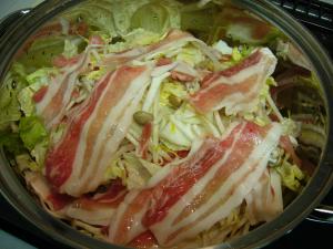 材料すべてを鍋にいれ、酒を回しかけ火にかける。