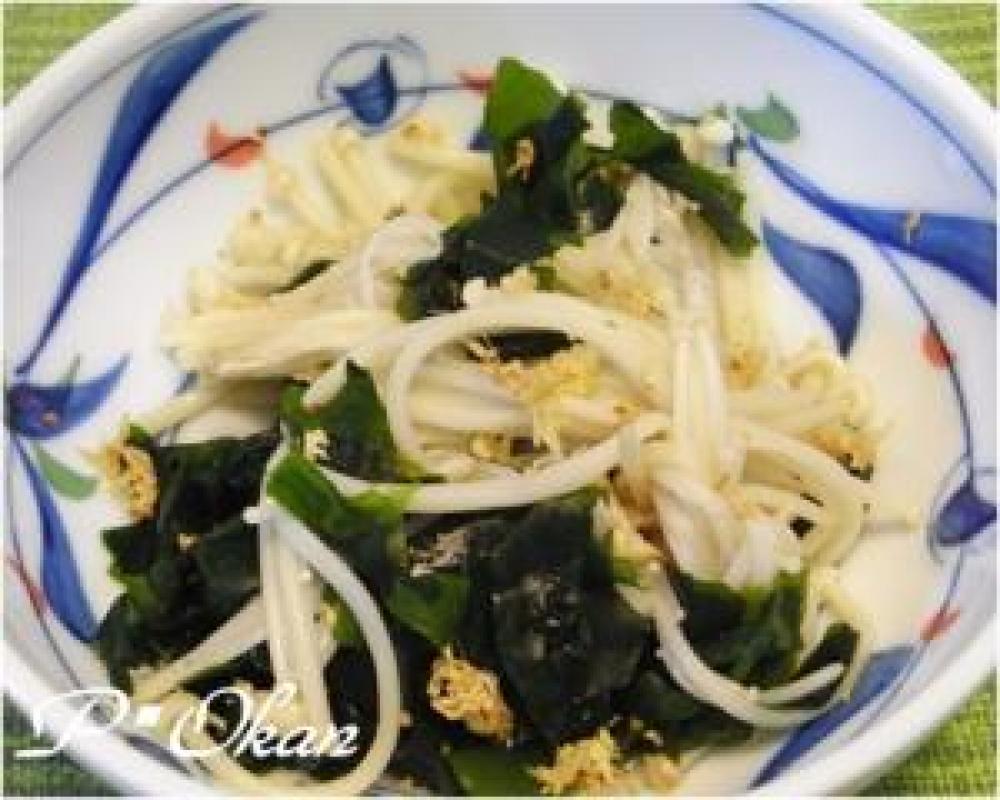 ワカメは水に戻す。エノキはさっと湯掻く。