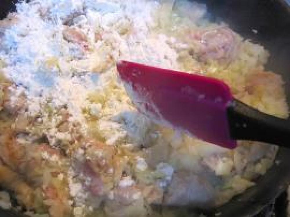![]() ★を入れて炒めて、少ししたら 鶏肉も入れて表面に焼き色を付けます。薄力粉をふって、よく混ぜます。 トロミをつけます。