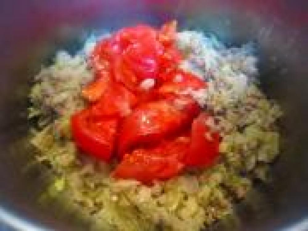 ![]() 炒まれば、挽肉も入れてトマトも入れて煮込みます。私は圧力鍋で3分です。