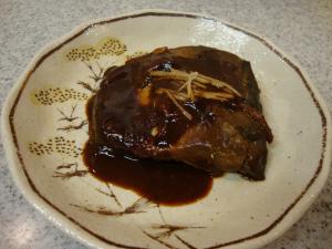 お皿にさばを盛り付け、煮汁をかけます。