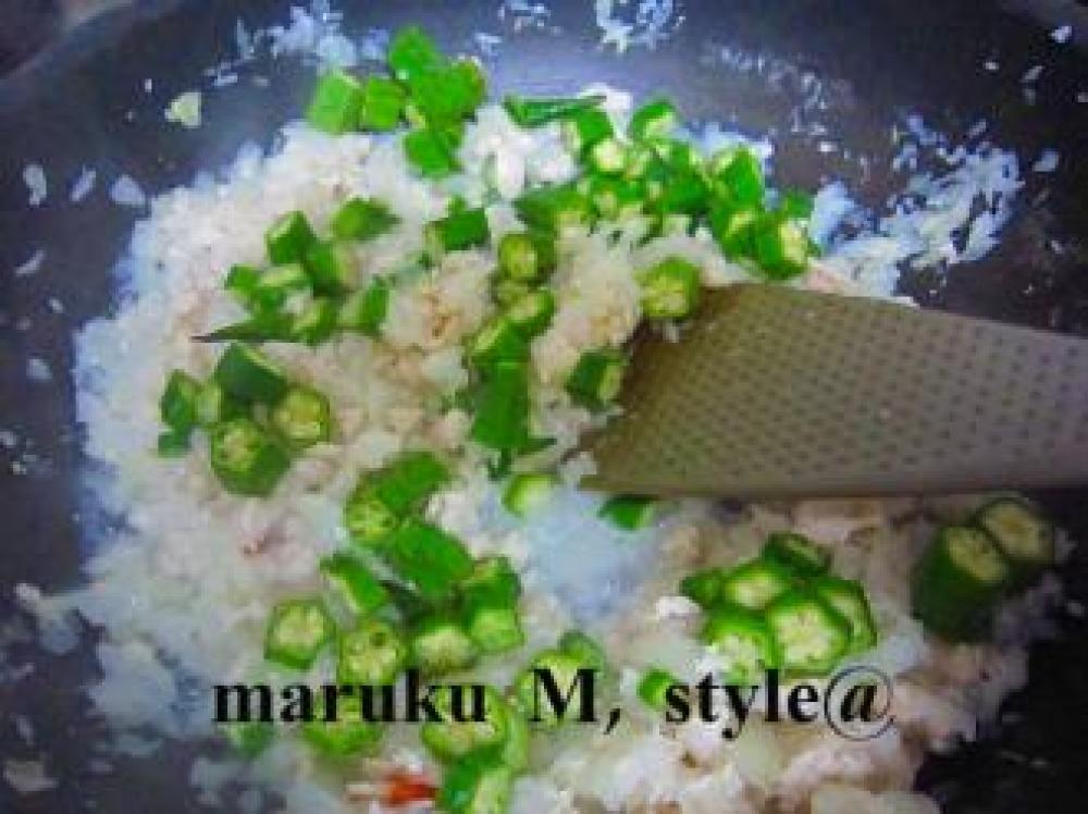 オクラも玉ねぎもみじん切りにしておきます。フライパンに玉ねぎをいれます。