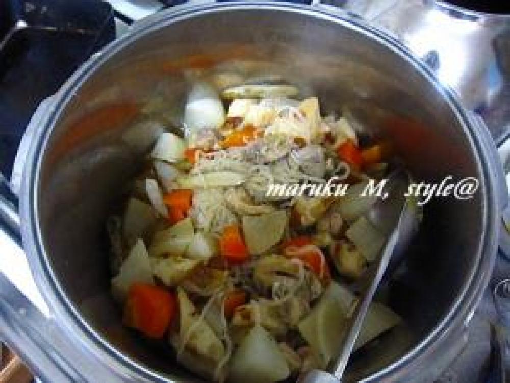 野菜を1口サイズに切り炒めないでお鍋に入れて(長芋以外)、干し椎茸(薄切り)の戻し汁を必ず入れます。