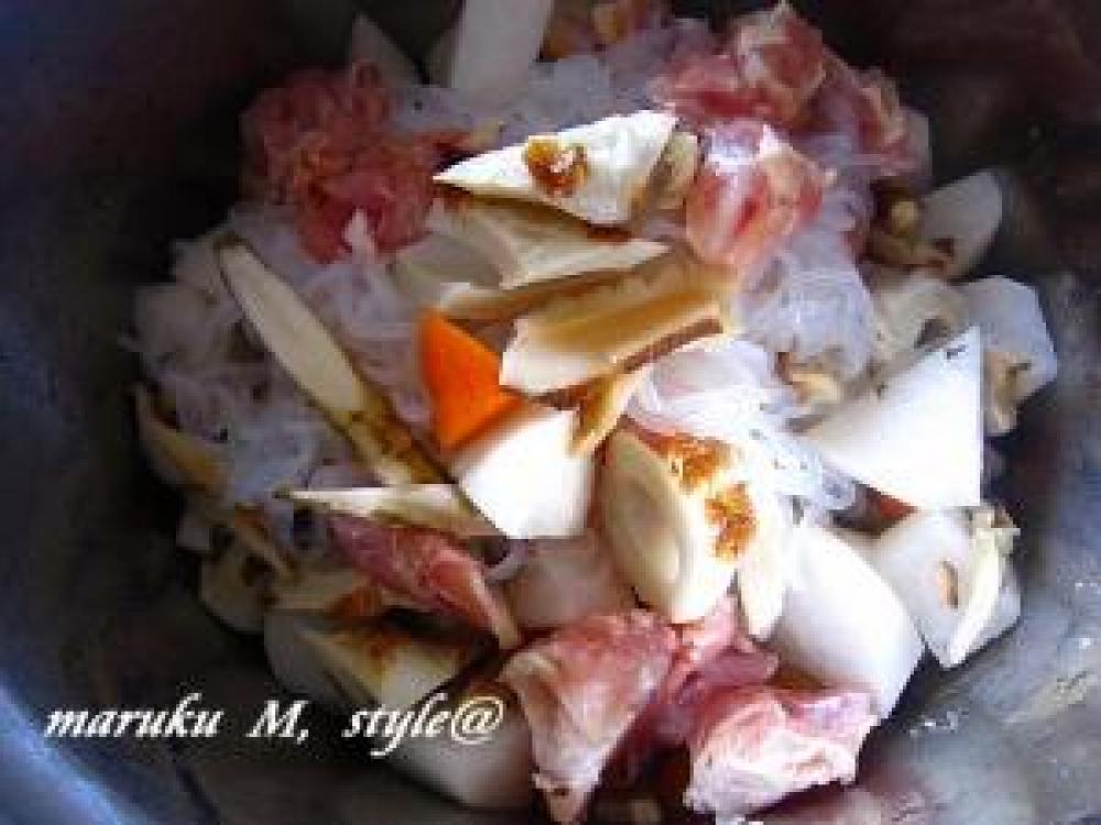 ![]() A~Eの調味料を入れて炊きます。圧力鍋だと圧力がかかってから、6分!普通のお鍋だとコトコト落し蓋をして炊いて下さい。