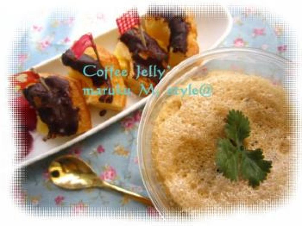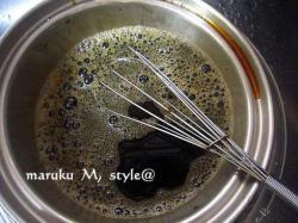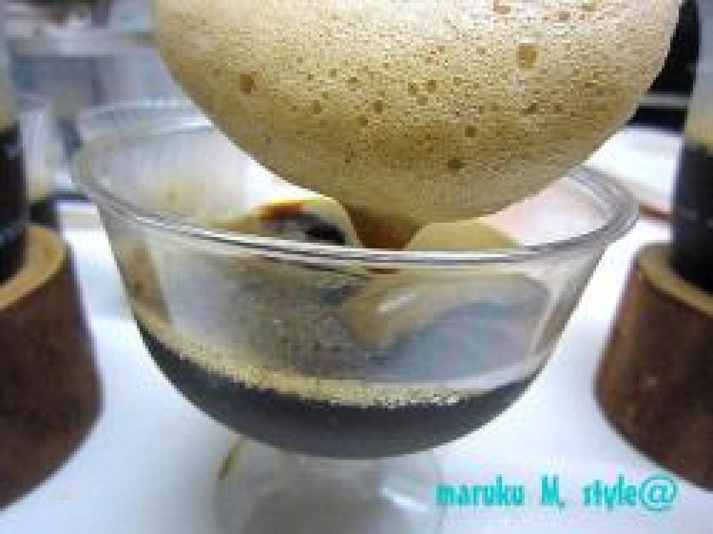 ![]() 1時間くらいしたら、先に冷やしておいたコーヒーゼリー1を取り出して⑤の液をもう1度軽く泡立ててから上にかけます。