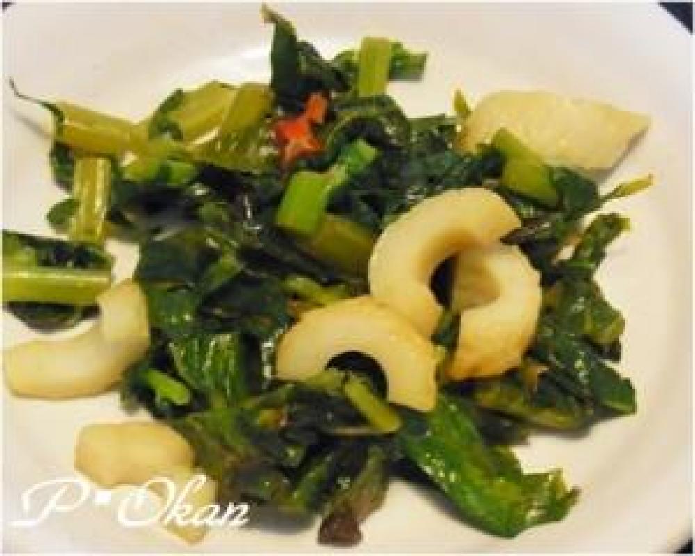 小松菜は5cm位に切る。チクワは薄くスライス