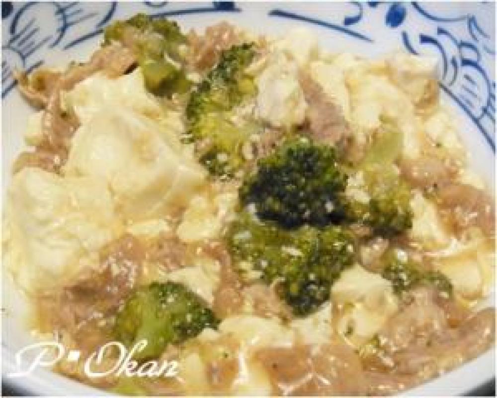 2に適当に崩した豆腐とブロッコリーを入れて煮込んだら出来上がり。