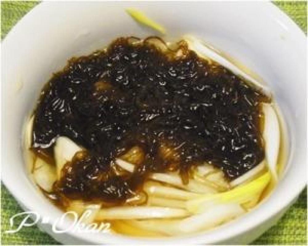パックのモズクと1の玉ねぎを和えたら出来上がり。