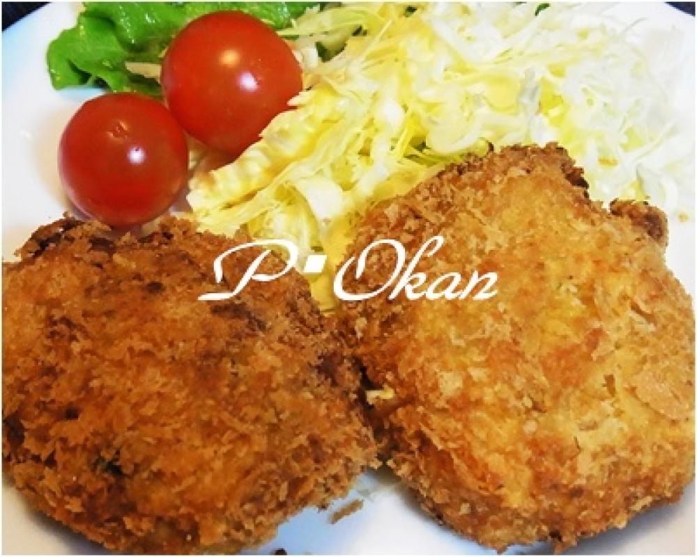 カボチャの皮を剥いて潰し、塩コショウし2を入れて小判型に丸めて小麦粉、卵液パン粉をつける。