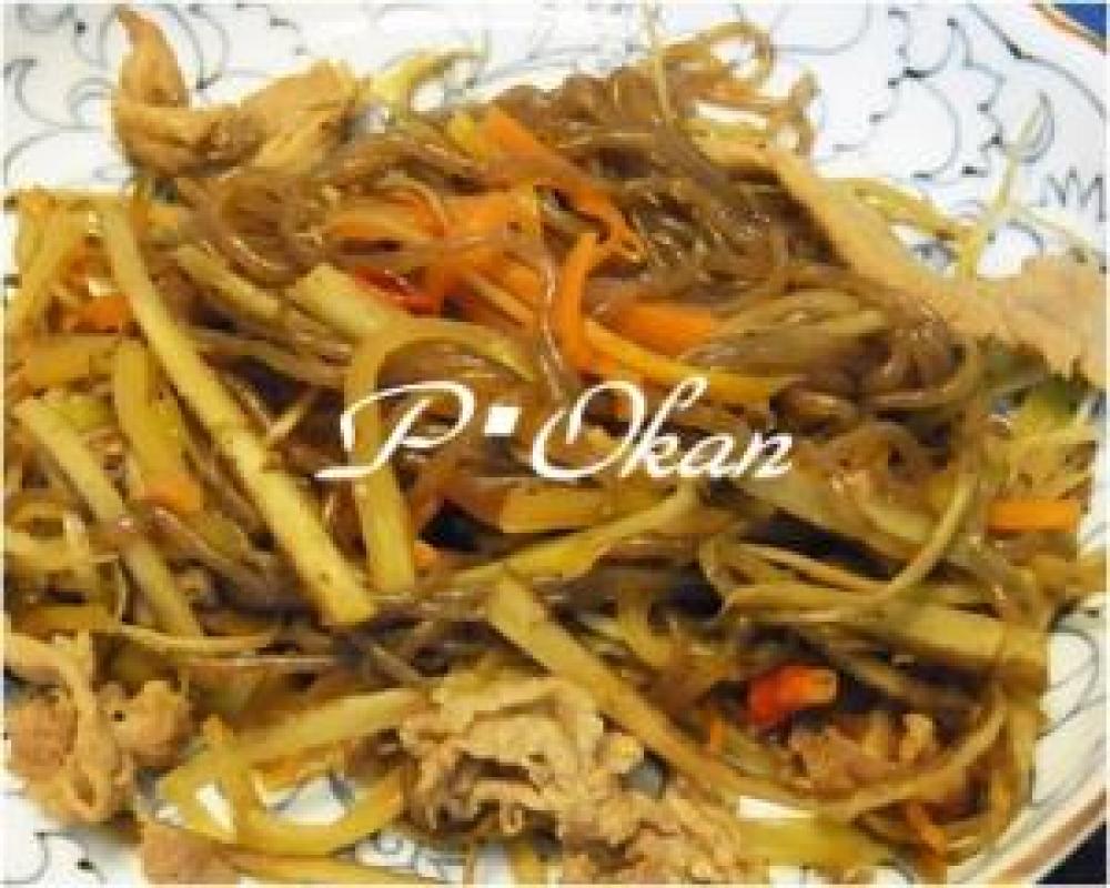 フライパンにごま油をひいて熱し、豚肉、糸コンを炒め、1、調味料もすべて入れて炒める。