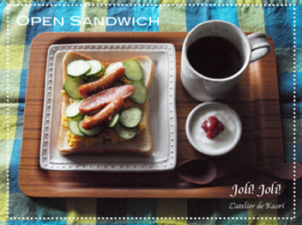 *きゅうりは輪切りに。(サンドイッチの一切れが小さいので)トーストにマヨネーズをぬって卵→きゅうり→ウインナーと重ねる。