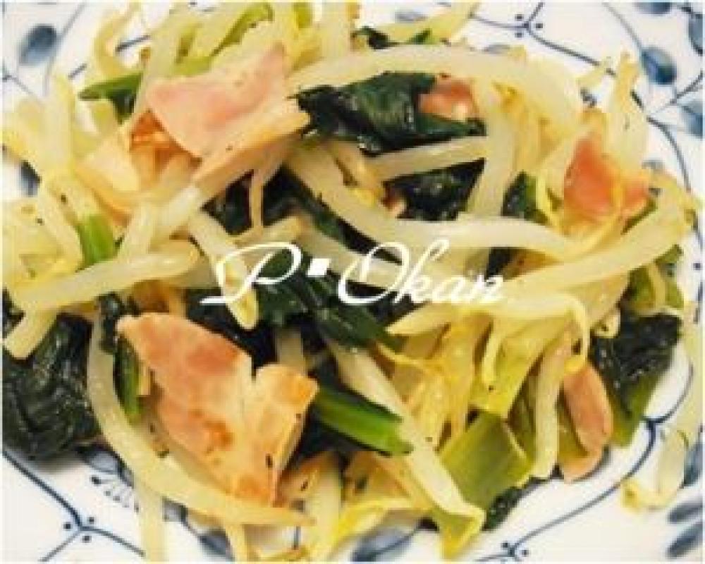 小松菜、ベーコンも入れて炒め、調味料で味付けしたら出来上がり♪
