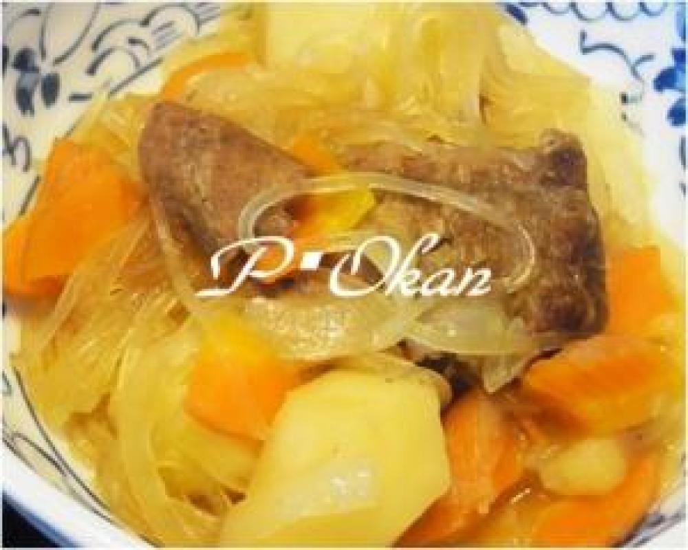牛スジは1度下ゆでして適当な大きさに切る。玉ねぎはくし型、人参はイチョウ切り、ジャガイモは一口大に切る。
