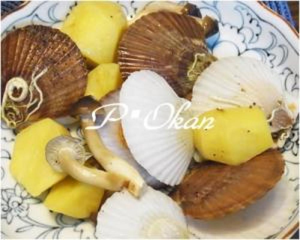 ホタテはよく洗う。ジャガイモは皮を剥いて一口大に切る。シメジは石附を取る。