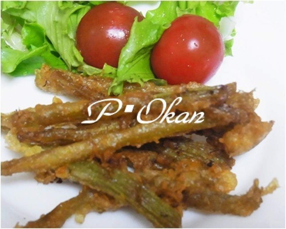 水に小麦粉、重曹を入れてダマにならないように良く混ぜ2の若ごぼうを入れて衣をつけ中温の油でカリッと揚げたら出来上がり。