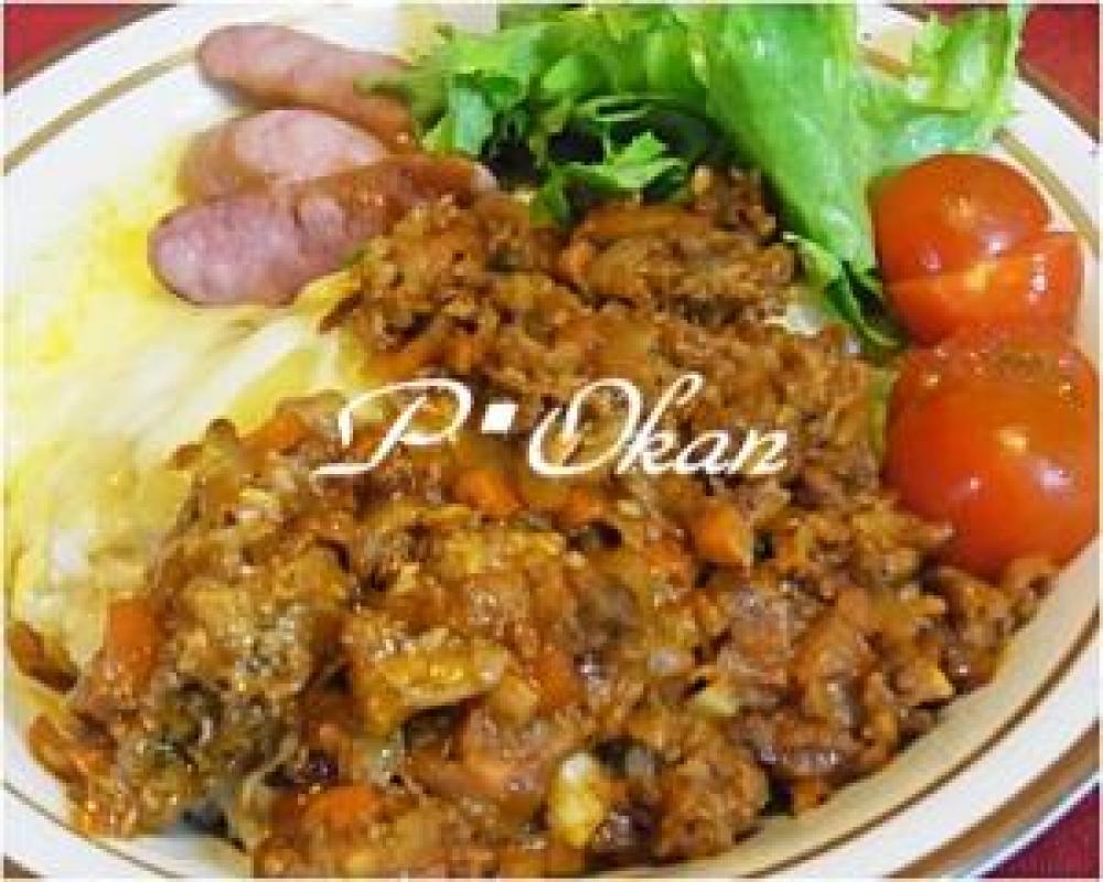 フライパンにサラダ油をひいて1をこがさないようによく炒め、ミンチも入れて炒める。