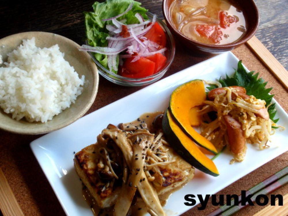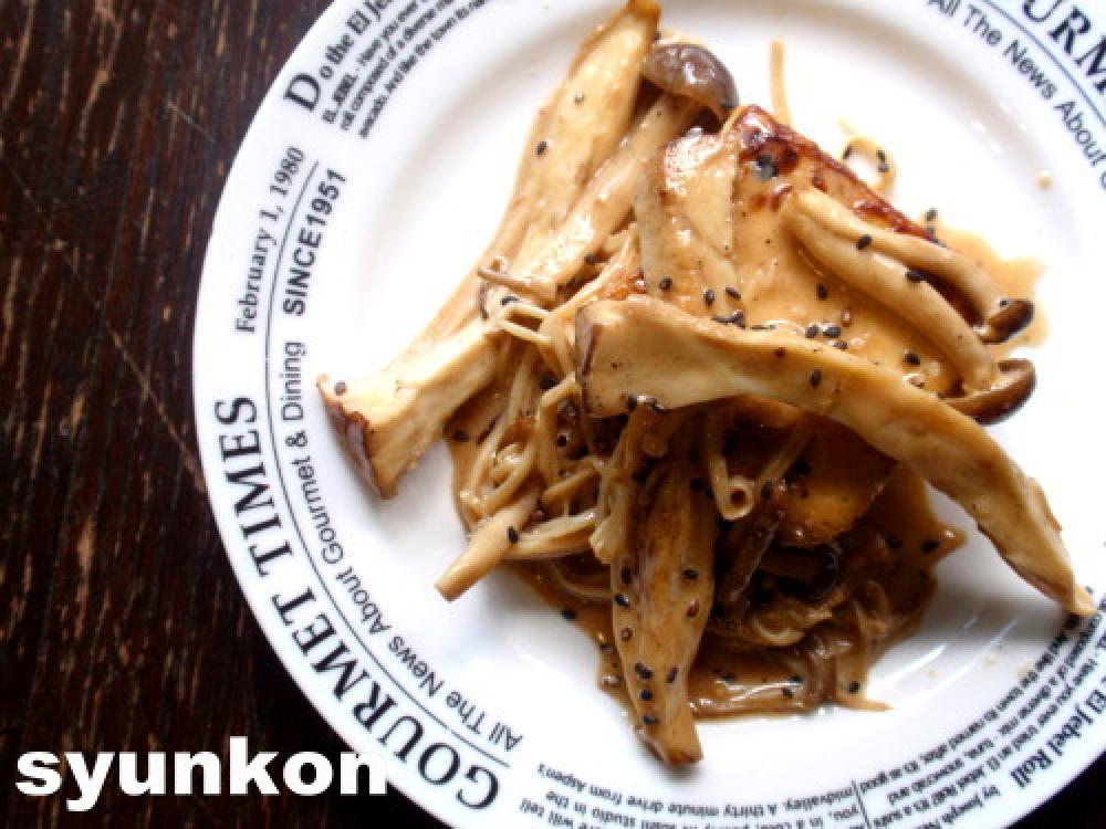 じゅわ~ってなってきのこがしゅんってなったら(わかりづらっ)めんつゆとゴマドレを加え、ちょっと煮詰めて、豆腐にかける。